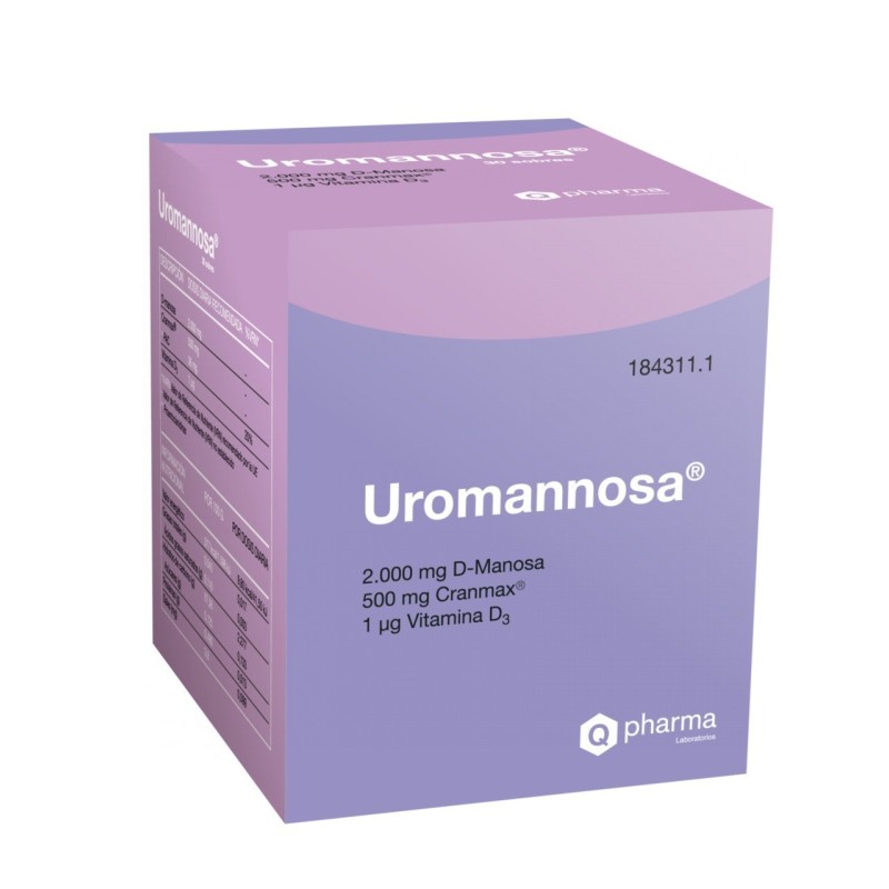 Por sobre: D-Manosa 2000 mg, Cranmax (extracto seco del fruto del arándano (Vaccinium macrocarpon Ait.)) 500 mg (PAC tipo A 36 mg), acidulante (ácido cítrico (E 330)), aroma (aroma de arándano), antiagregante (dióxido de silicio), Vitamina D3 (Colecalciferol).
